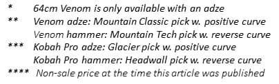 The Swift is basically a simpler, lighter version of the Venom and was released at the same time in 2017. It comes with an adze (no hammer option) and the head is made of a single piece of stainless steel so the pick’s not replaceable. This makes the axe simple and fairly light but also less versatile, more of a single-purpose type mountaineering axe designed for glaciers and snow.